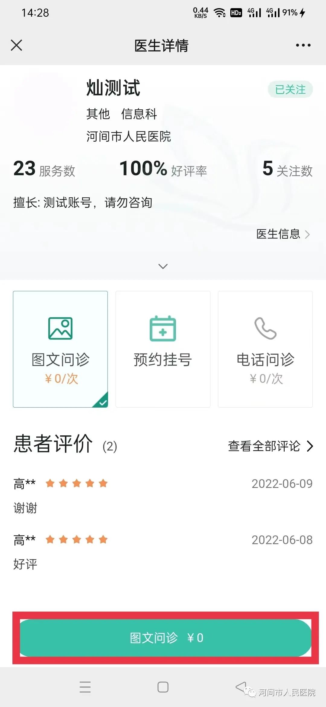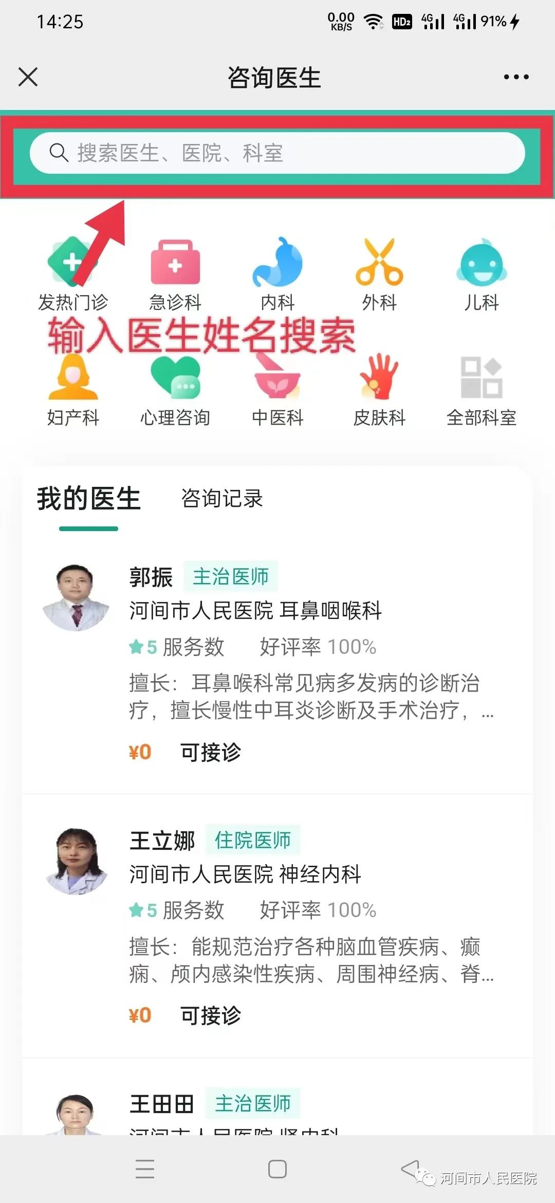 點擊“谘詢醫生”,進入網上問診平台,選擇想要谘詢的醫生,點擊“圖文谘詢”,描述詳細病情,進行在線問診;