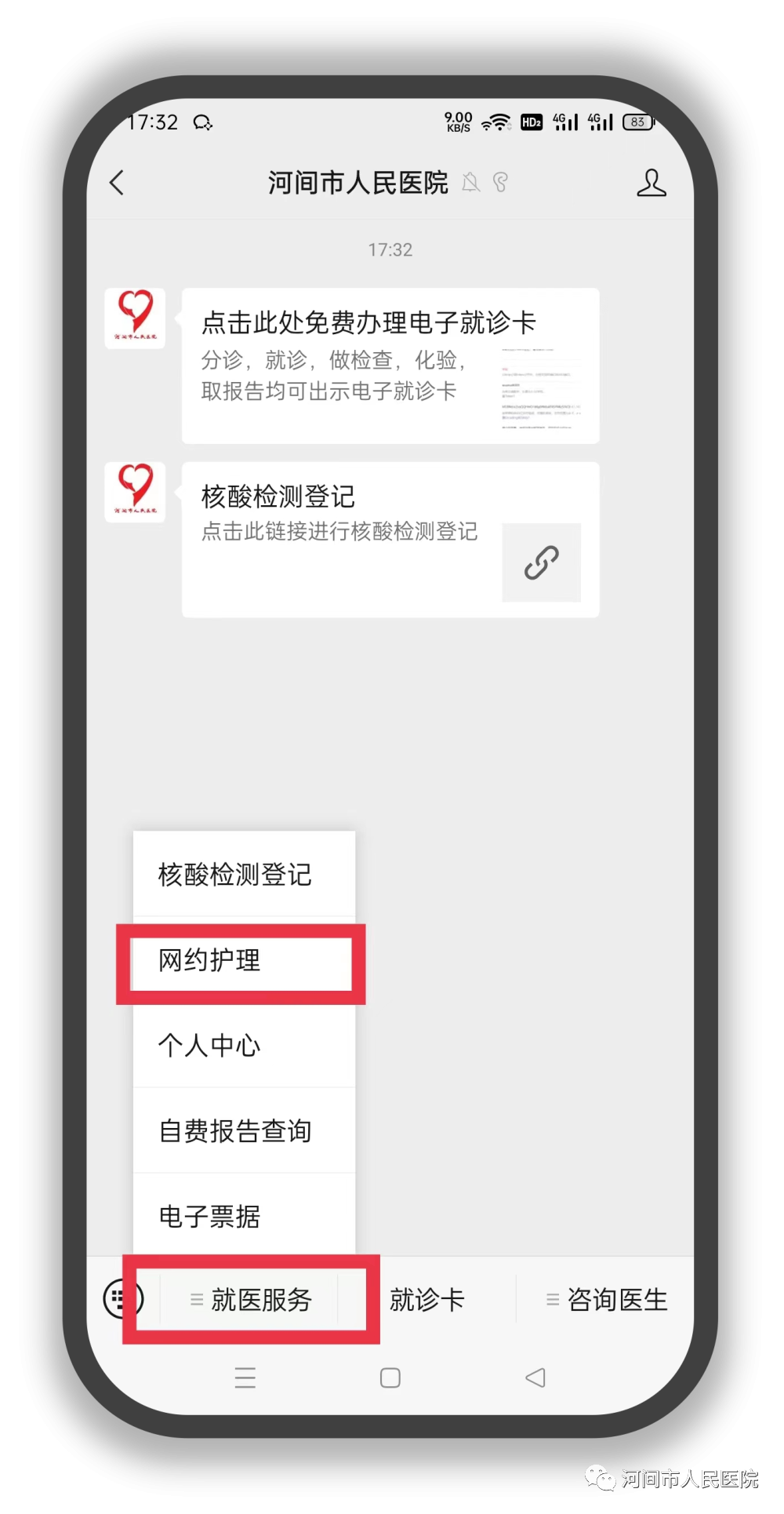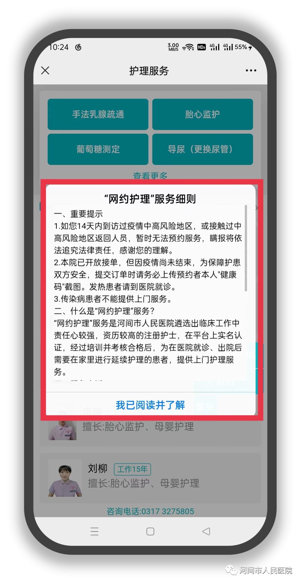 3.選擇【就診卡】,認真查看“網約護理”服務細則,點擊【我已閱讀並了解】;