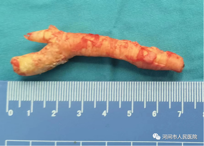 術中顯露病變血管,完整剝除硬化斑塊,切除的斑塊硬化嚴(yan) 重。