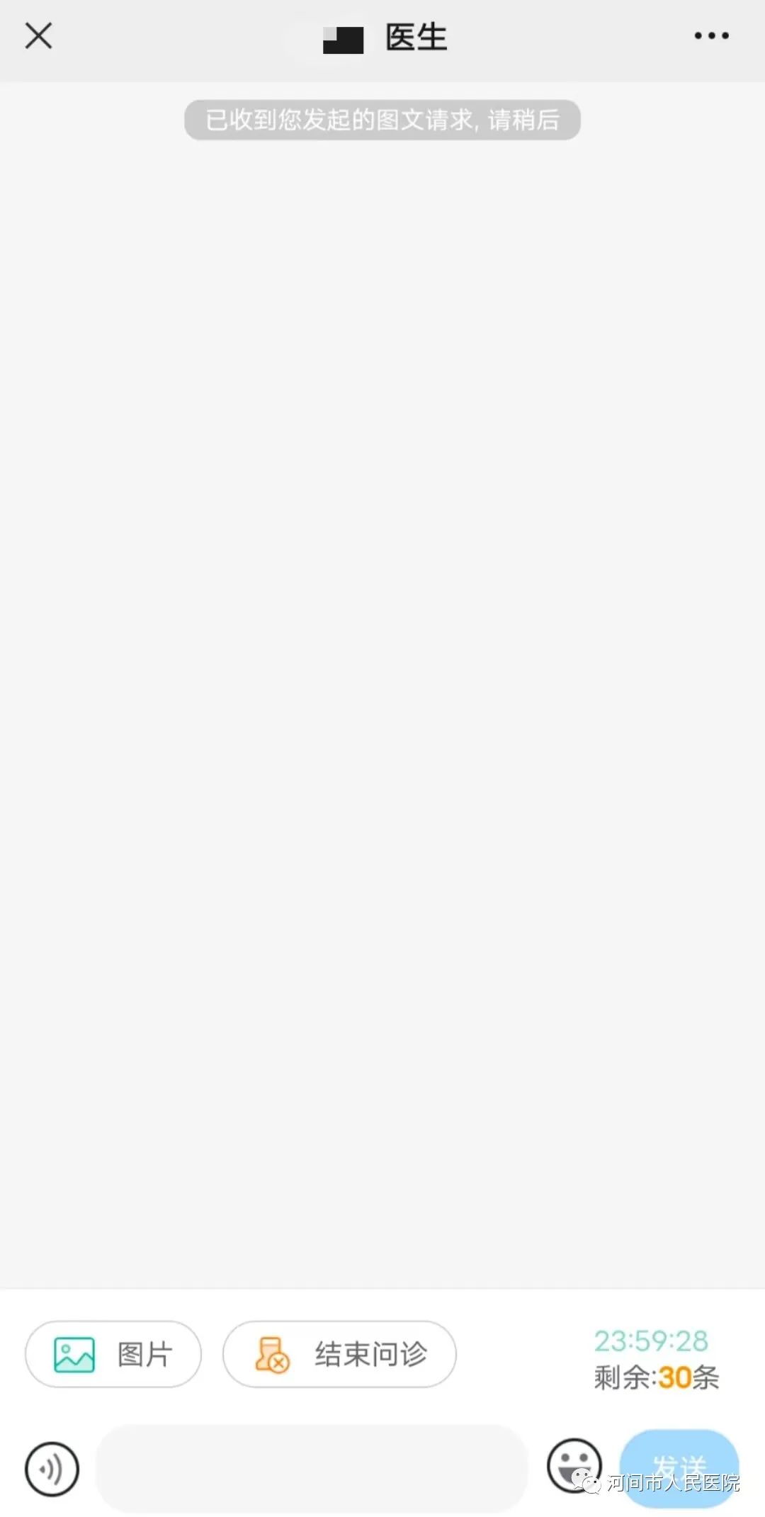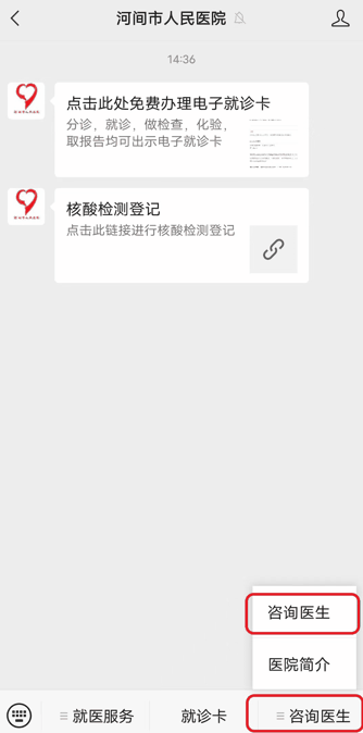公眾(zhong) 號內(nei) 點擊“谘詢醫生”,進入線上問診平台。選擇要谘詢的醫生,點擊“圖文谘詢”後選擇電子健康卡,描述詳細病情,進行在線問診。