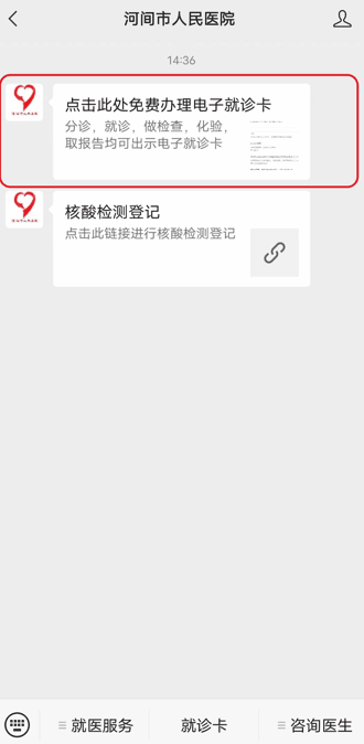 點擊公眾(zhong) 號內(nei) 提醒消息,辦理電子健康卡。無卡患者可掃描身份證或填寫(xie) 就診人信息辦理電子健康卡;就診過的患者可綁定已有健康卡。