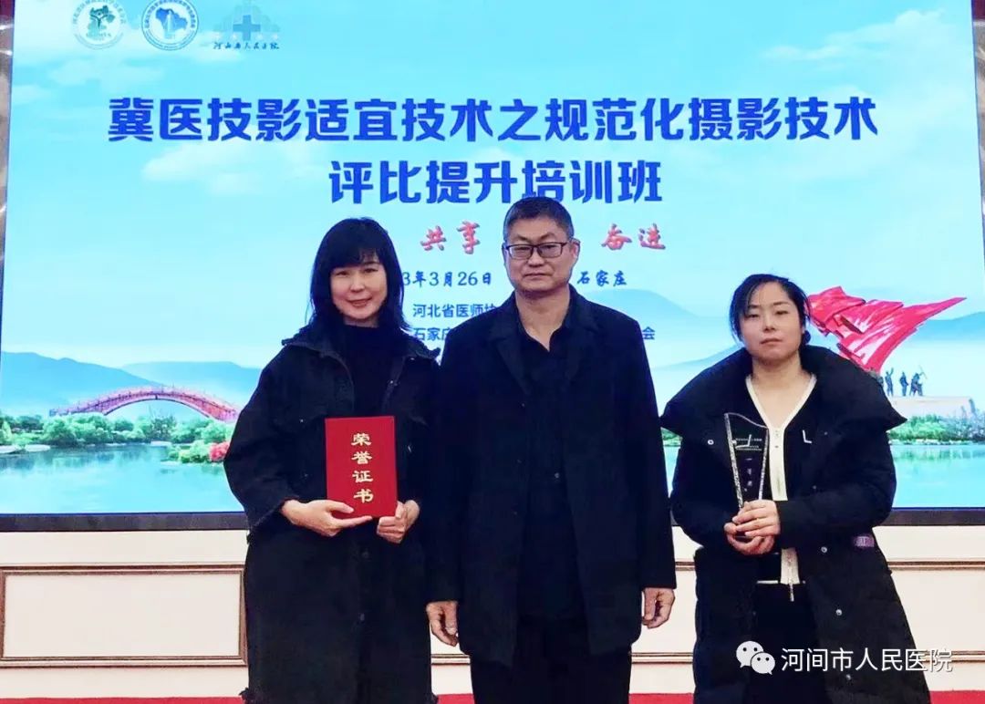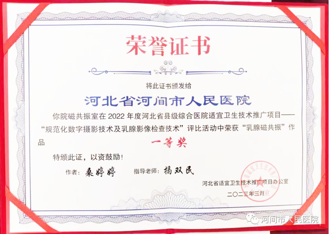 陽春三月,傳(chuan) 來喜訊。3月26日上午,由河北省衛健委適宜衛生技術推廣項目辦公室組織的河北省縣級綜合醫院規範化數字影像技術及乳腺影像檢查技術大賽頒獎大會(hui) 在石家莊隆重舉(ju) 行。我院磁共振室在指導老師揭雙民主任的帶領下取得優(you) 異成績,桑婷婷技師獲數字乳腺磁共振檢查技術一等獎。
