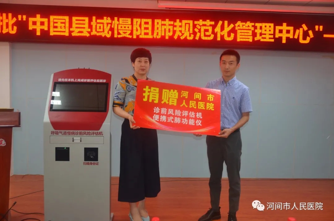 市醫院副院長李冬梅接受阿斯利康公司捐贈的診前風險評估機、便攜式肺功能儀(yi) 。